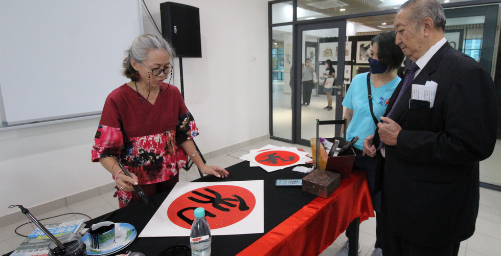 翰墨情浓献尊孔书画义展于12月11日当天迎来第二轮的名家现场挥毫,参与这次挥毫的名家有谢欣颐老师、王雅老师与李丽珍老师。王雅老师写了郑燮《竹石》的诗句赠予尊孔。郑燮在《竹石》写咬定青山不放松,立根原在破岩中。千磨万击还坚劲,任尔东西南北风。王雅老师表示,《竹石》正如华教、正如尊孔,翠竹挺立在青山的景象,竹子不畏艰难、不屈不饶与大自然对抗的顽强精神,一个“咬”字将竹子拟人化,更是凸显出了华文教育的坚韧不拔。而立根原在破岩中更是寓意着华教即便在环境不佳的情况下仍能根基牢固的扎根,竹的根茎深深地扎入破岩中,竹与石,浑然一体,无石竹不牢固,无竹山不青翠,竹与石、石与竹相辅相成。而诗句的最后,千磨万击还坚劲,任尔东西南北风,更是说明了竹子经历了无数磨难与打击的坚韧,即便是酷暑或严冬也能屹立不倒。谢欣颐老师则是现场演示了她擅长的水墨结合动漫的人物绘制,老师现场绘制了一位侠客;而李丽珍老师则挑战了书写100幅形态各异的“兔”字,并以义卖的方式在现场售卖。出席这场现场挥毫的人士有沈德和董事长、侯渊富署理董事长、王金水董事、蔡兴明董事、吴宪民董事、萧岓年董事与李庆进董事。。翰墨情浓献尊孔书画义展旨在为本校筹募建校基金,欢迎有意购买书画支持这次筹款的人士浏览义展画册 http://sas.confucian.edu.my/publications/hanmoqingnong-booklet/mobile/index.html